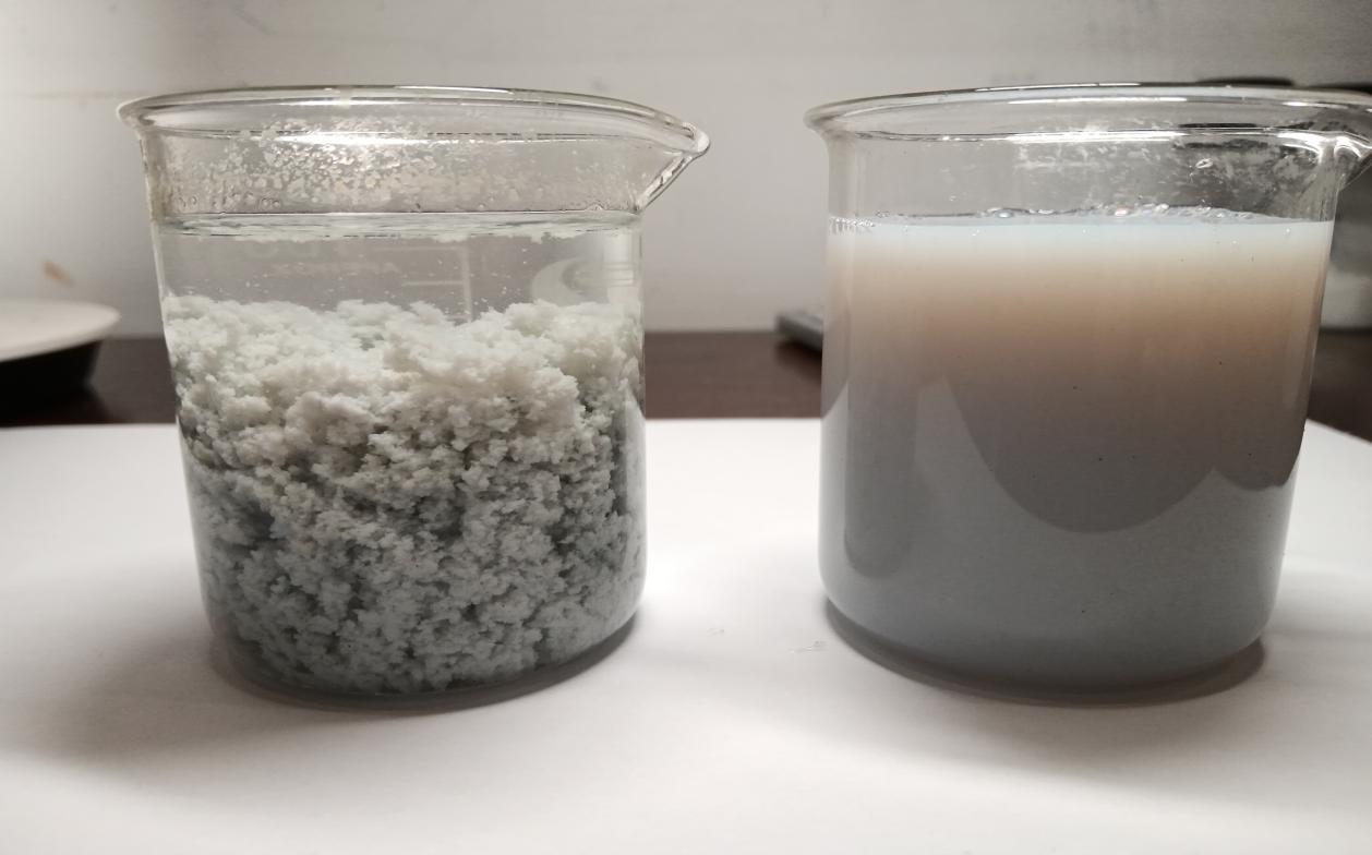 取原水100ML,測定PH值為7.8,符合破乳劑的使用范圍,直接添加千分之1.5的破乳劑,攪拌5S,然后加入百分之2的聚丙烯酰胺陰離子(1‰的水稀釋液),攪拌5S后沉淀,使用該破乳劑上清液清澈透亮,污泥沉淀緊實。