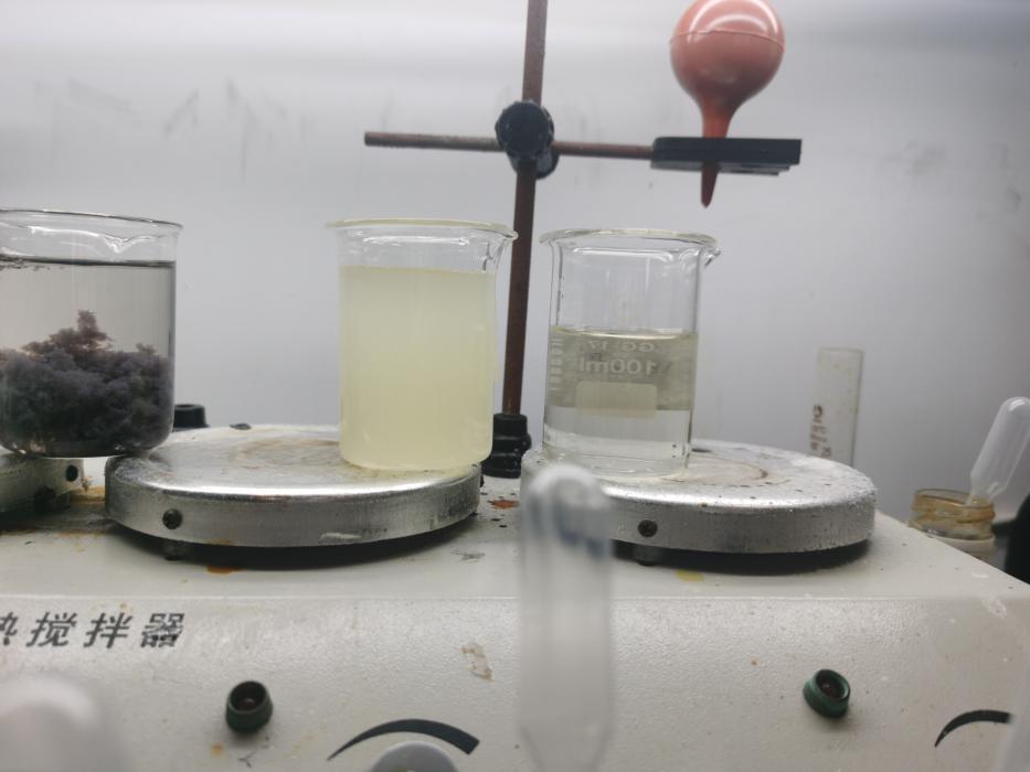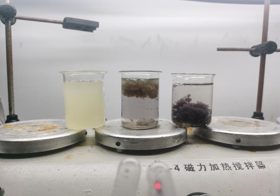 現(xiàn)場取得取污水100ML,測出PH值為4.2,加入千分二的FQ-WD1,攪拌10s,然后加入千分之六的25%液堿,最后加入百分之二的PAM陰離子(1‰的水溶液)沉淀即可;同時還取得了客戶現(xiàn)有的脫色劑,按照同樣的方法以及添加量進行比對試驗。注:從左至右依次為原水,客戶現(xiàn)場取脫色劑實驗,凡清脫色劑實驗。