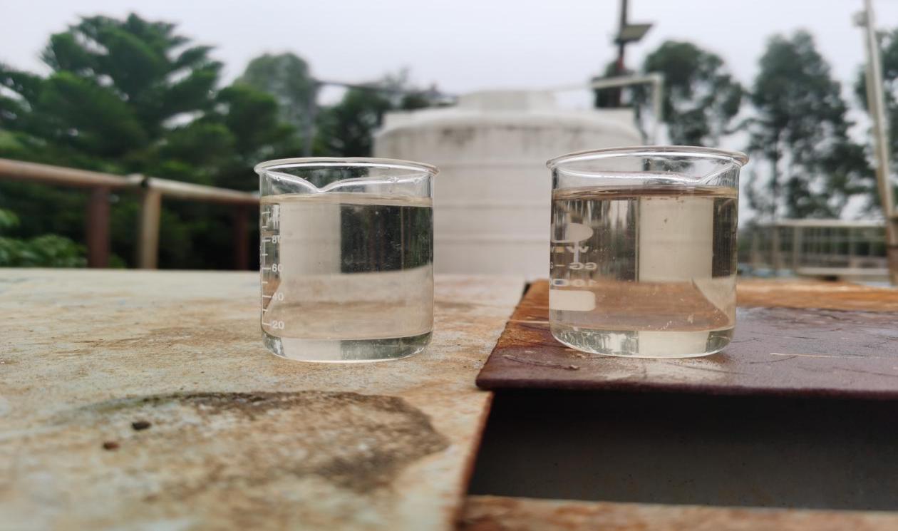 凡清實(shí)驗(yàn)室取回原水,經(jīng)過反復(fù)實(shí)驗(yàn)得出。取原水100ml,使用復(fù)合堿將PH值調(diào)至7.5,然后加入300ppm的FQ-WD13,然后加入200ppm的凈水劑,攪拌10S,然后加入1.5%的聚丙烯酰胺陰離子(1‰的水溶液)攪拌10S。注:左圖為上機(jī)實(shí)驗(yàn)取上清液,右圖為現(xiàn)應(yīng)急處理后二沉池出水。