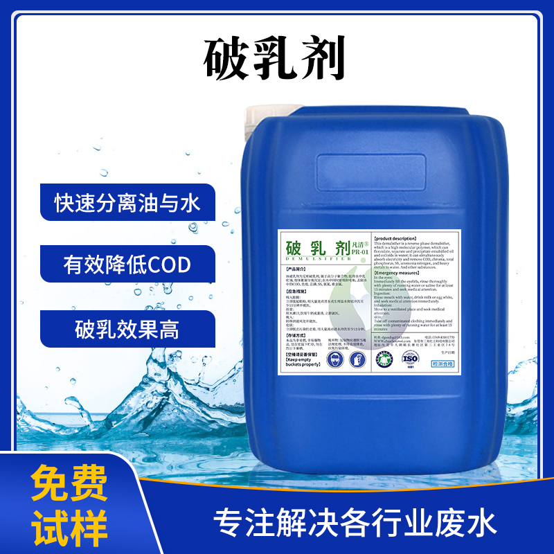 破乳劑是集破乳、脫脂、絮凝、分離、去除有機物等多種功能于一身的高效表面活性劑。針對難乳化、切削液、含油含脂廢水,使乳化顆粒內(nèi)相中的水分突破界面膜進入外相,破壞已形成的原油乳化狀態(tài),并完全分離油和水,出水清澈達標。還可以有效防止油水混合物再次乳化,降低油水混合物的黏度。